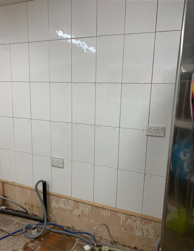 The new kitchen has floor to ceiling tiles.